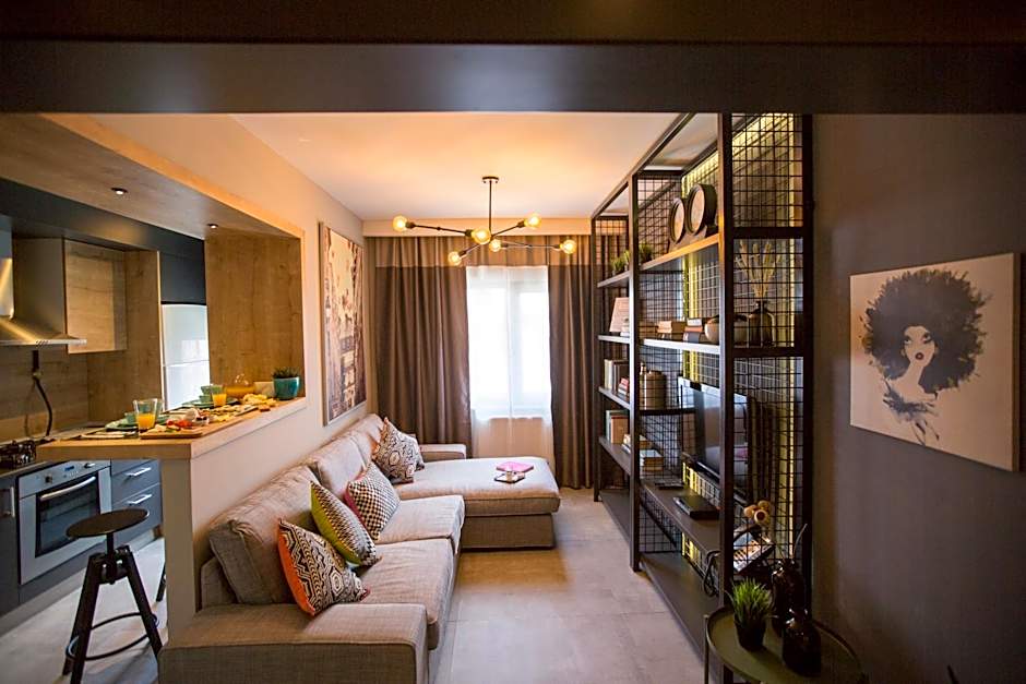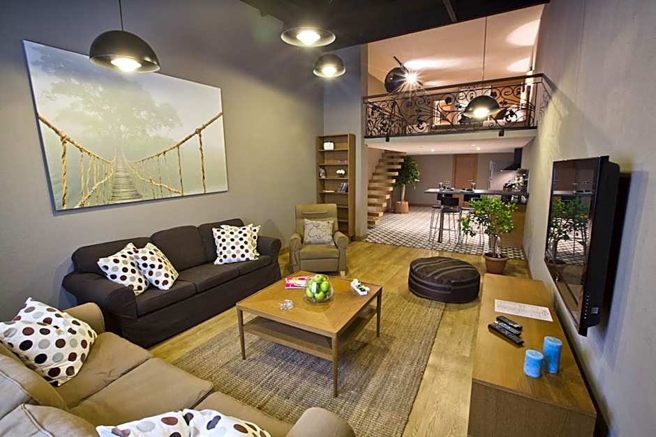 This loft offers a kitchen, modern bathroom, and a large living room with high ceilings, sofas and a LCD TV on the lower floor. The bedroom is on the upper floor with a large double bed.
